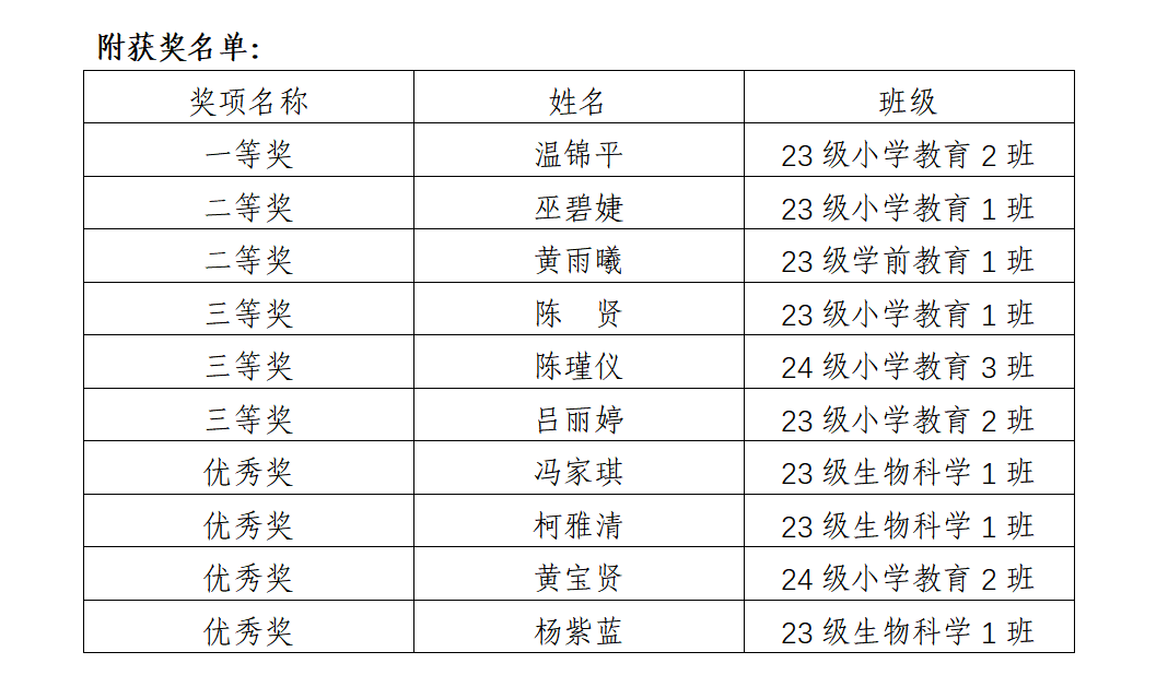 本次活动以线上和线下相结合的方式开展。在决赛现场,参赛者围绕本次活动主题进行了心得分享与收获展示。现场活动氛围热烈而有序;选手们准备充分,表现优异;观众踊跃参与游戏互动环节,展现出良好的互动性。透过参赛作品,我们深刻感受到了自律行为对个人成长的深远影响。经过工作人员和评委公平公正的评选,十份作品脱颖而出,2023级小学教育2班温锦平获得一等奖;2023级小学教育1班巫碧婕等9位同学分别获得二等奖、三等奖和优秀奖。