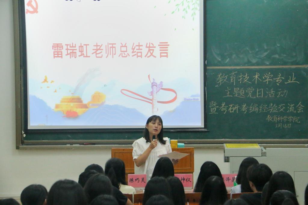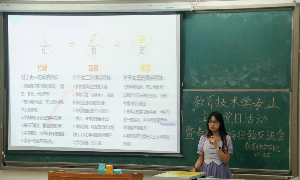 518日下午,教育技术学专业学生党支部第二教学楼114教室开展了以“聚青春之风,扬奋斗之帆”为主题的党日活动暨考研考编经验交流会。2020级教育技术学专业杨芷悦、陈巧灵、梁坤仪、吴泽盈等四位同学作为代表进行经验分享本次会议由朋辈辅导员龚碧莹主持,教育技术学专业学生党支部书记雷瑞虹出席,该专业共计七十余名同学参加。