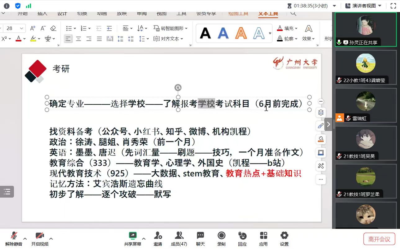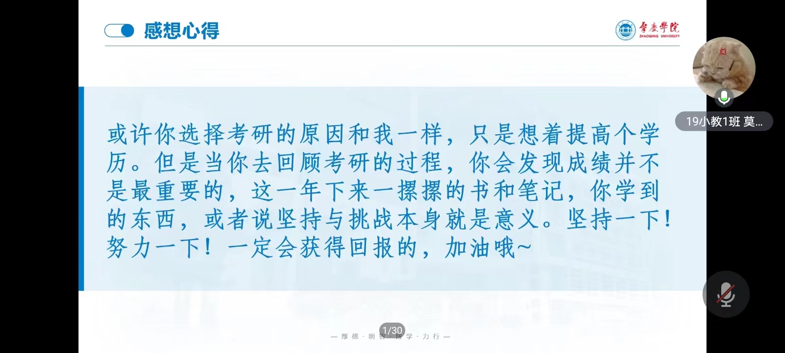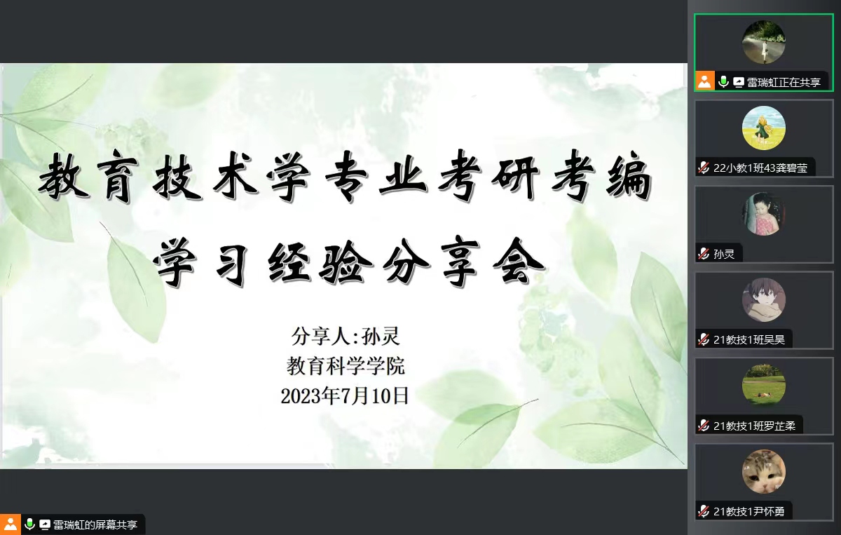 7月10日,特邀2021届教育技术学校友孙灵参加教育技术学专业考研考编经验线上分享会。孙灵围绕着“择校经验、学习方法、资源查找、时间安排”等方面,分享了自己考研考编的经验技巧。