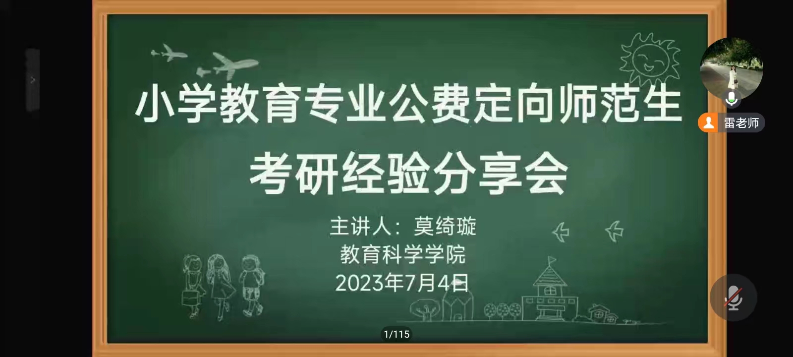7月4日,特邀2023届毕业生莫绮璇参加小学教育专业公费定向师范生考研经验线上分享会。莫绮璇强调,同学们要在准确定位自身能力与发展需要的基础上,选择理想的学校与专业,选择适合的老师和学习方式。
