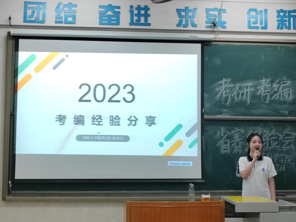 6月19日,特邀2023届毕业生黄珊珊、陈育芬、黄卓熙参加21级小学教育专业非定向班考研、考编、省赛经验分享会。黄珊珊勉励同学们考研一定要有计划,避免情绪内耗;陈育芬鼓励同学们要敢于尝试,跳出舒适圈;黄卓熙激励同学们要相信自己的潜能,多实践、多总结。