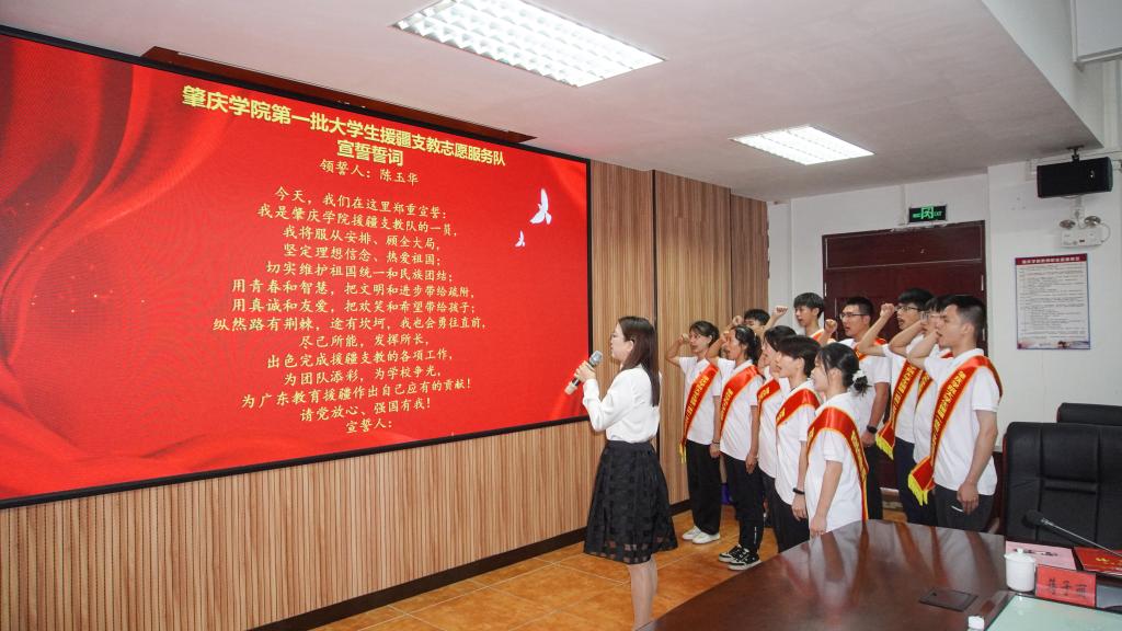 出征仪式上,谢冠华送上殷切期盼,表示支教工作责任重大,希望同学们在援疆支教工作中坚定政治立场,以高度的政治责任感完成支教任务,将立德树人内化到教育教学的各领域、各方面、各环节。他强调,援疆同学不仅要刻苦实践锻炼,不断锤炼教书育人的本领,还要守纪律听指挥,强作风展形象,当好粤疆两地友谊的使者,展示广东省和肇庆学院的良好形象。谢冠华指出,越是艰苦的环境,越能磨炼人的品质,考验人的毅力,希望援疆队员们敢于担当作为,勇于攻坚克难,在援疆支教过程收获受益终生的东西。