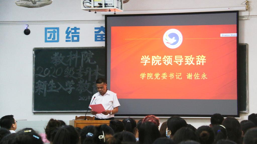 谢佐永在致辞中,对专升本新生表示热烈欢迎,并向新生们介绍了学院的基本情况和学院往年优秀专升本学生的参赛获奖情况、考研战绩及援藏情况等。期间,谢书记还向新生们提出了几点希望和要求,他希望同学们珍惜党和国家的政策红利,心怀感恩,志存高远,脚踏实地,不断提升师范生技能,积极参与课堂竞赛、志愿服务,拼搏奋斗以不负时代嘱托。他表示当代青年要在实现民族复兴的号召下奋勇争先、勇担使命,把个人理想追求融入到党和国家的事业当中去,了解国情学情,用青春书写无悔时代的华丽篇章。