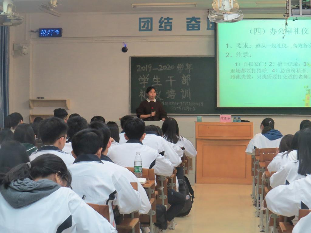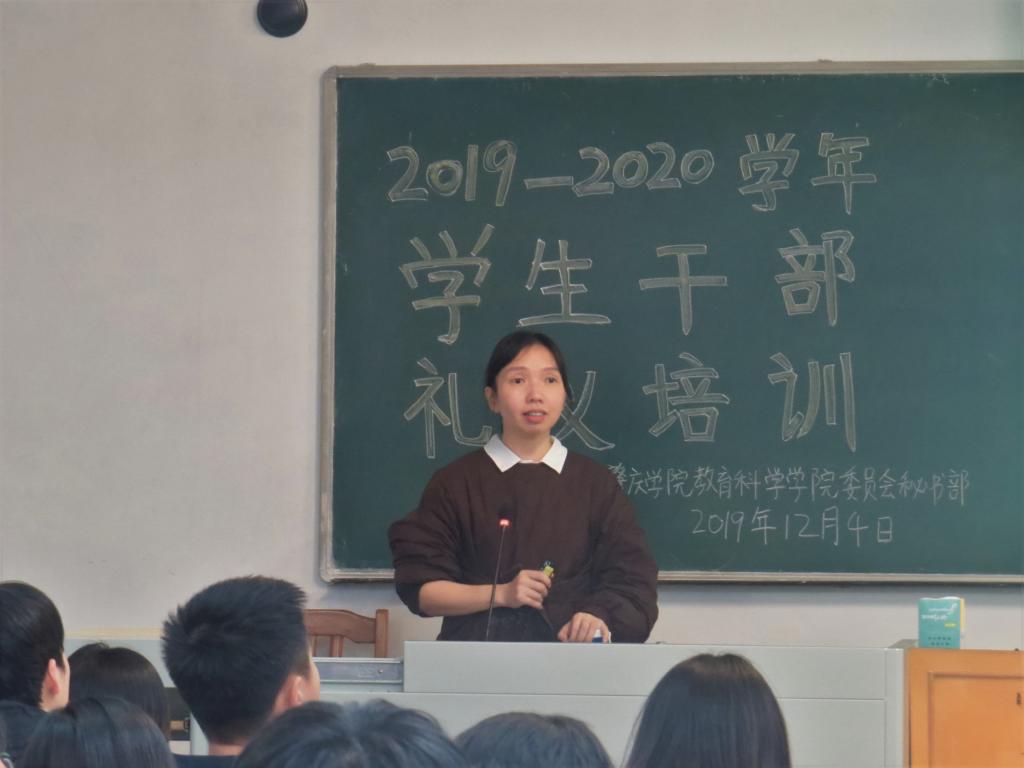 本网讯(通讯员/黎敏思 詹妮 拍摄/吴漫旋 责编/刘瑞雪)为提高教育科学学院学生干部的礼仪素养,我院于2019年12月4日19:30在第二教学楼605室举办“2019-2020学年学生干部礼仪培训”专题讲座。学院专职组织员何秀华为本次培训讲座的主讲人。辅导员兼团委书记刘瑞雪、2019级各班团支书及六大学生机构的2019级学生干部共123人出席本次讲座。