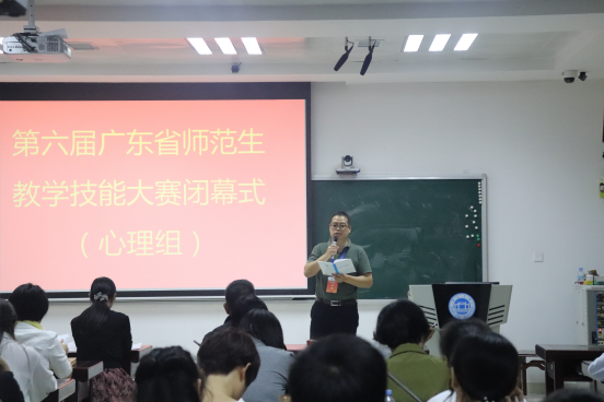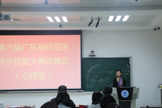 来自华南师范大学、广州大学等9所本科院校的45位选手参加了此次比赛。本次大赛由教学设计、说课、模拟授课和评委提问四个环节组成,主要考察的是师范生教学设计思路、课件制作、说课以及授课等方面的综合能力。在比赛过程中,选手巧妙地运动教学道具,使得授课内容生动,加深学生对教学内容的理解,台下模拟学生与参赛者选手积极互动,高度还原了课堂讲课的场景。参赛选手们精彩的讲解以及PPT内容吸引人的眼球,调动学生学习兴趣,使学生更容易转变思维,与人产生强烈的共鸣,稳重大方的仪态,展现了较强的教学技能和准教师的风采。在27日下午的闭幕式上,华南师范大学心理学院副院刘学兰、广州大学教育科学学院副院长刑强分别代表作为评委组组长发言,他们对赛事的组织工作给予了充分肯定,同时认为今年的选手较去年相比在综合素质、师范技能等方面有明显的提高,指出赛事真正实现了以赛促学的目的。