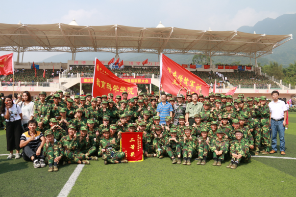 上午8:30分,大会在庄严肃穆的国歌声中拉开了帷幕。阅兵仪式上,和飞校长依次巡阅了各院系的新生军训方队。一句句“校长好!”、“为学校争光!” 口号铿锵有力,响彻第二田径场。新生们排列分列式,身着迷彩服,脚踏迷彩鞋,精神激昂,坚挺整齐地走过主席台接受检阅。同学们个个精神抖擞、意气风发、步履铿锵、口号嘹亮,充分展现了2017级新生昂扬向上的精神风貌和军 训工作的丰硕成果。大会上,我院17级应用心理学专业的乔婷同学作为2017级新生代表发言:“诉说13天军训中的酸甜苦辣,希望砚园人通过军训的磨练,更能懂得厚德、明智、博学、力行的精神。”最后,我院38连(学前本科和学前专科班)被评为二等奖,36连(教技和小教专班)被评为三等奖,新生们在13天严格的军训下终于获得了可观的成绩。