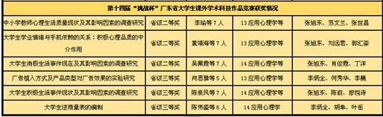 本网讯(通讯员 李晓杰)近日,团省委网站公布了第十四届“挑战杯”广东大学生课外学术科技作品竞赛获奖名单,教育科学学院选送的学生作品中,有3个作品获省级二等奖、3个作品获省级三等奖,这是我院近年来积极引导和鼓励学生参与课外科技科学研究、培养学生创新思维、创新能力和学生科研能力,实行全员育人的教育成果。