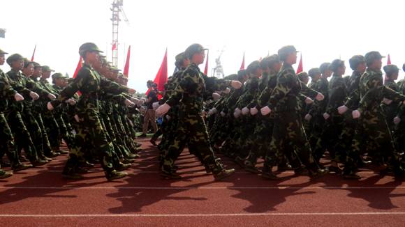 我院345名新生在军训中被分编成4个连队。晨光未现,同学们已经洗漱完毕来到训练场集中,伴着旭旭东升的朝阳,响亮的口号响彻整个校园。在教官和连助严格的操练下,同学们严守军纪,认真完成军训任务,充分表现了当代大学生优秀的风貌。在军训开始的前几天,新生们军姿站立、踏正步等项目的训练就效果显著。学校还安排穿插了消防演练、定向越野等项目的训练。赤日当空,但同学们的热情不减,大家都精神抖擞地参与到了训练当中。