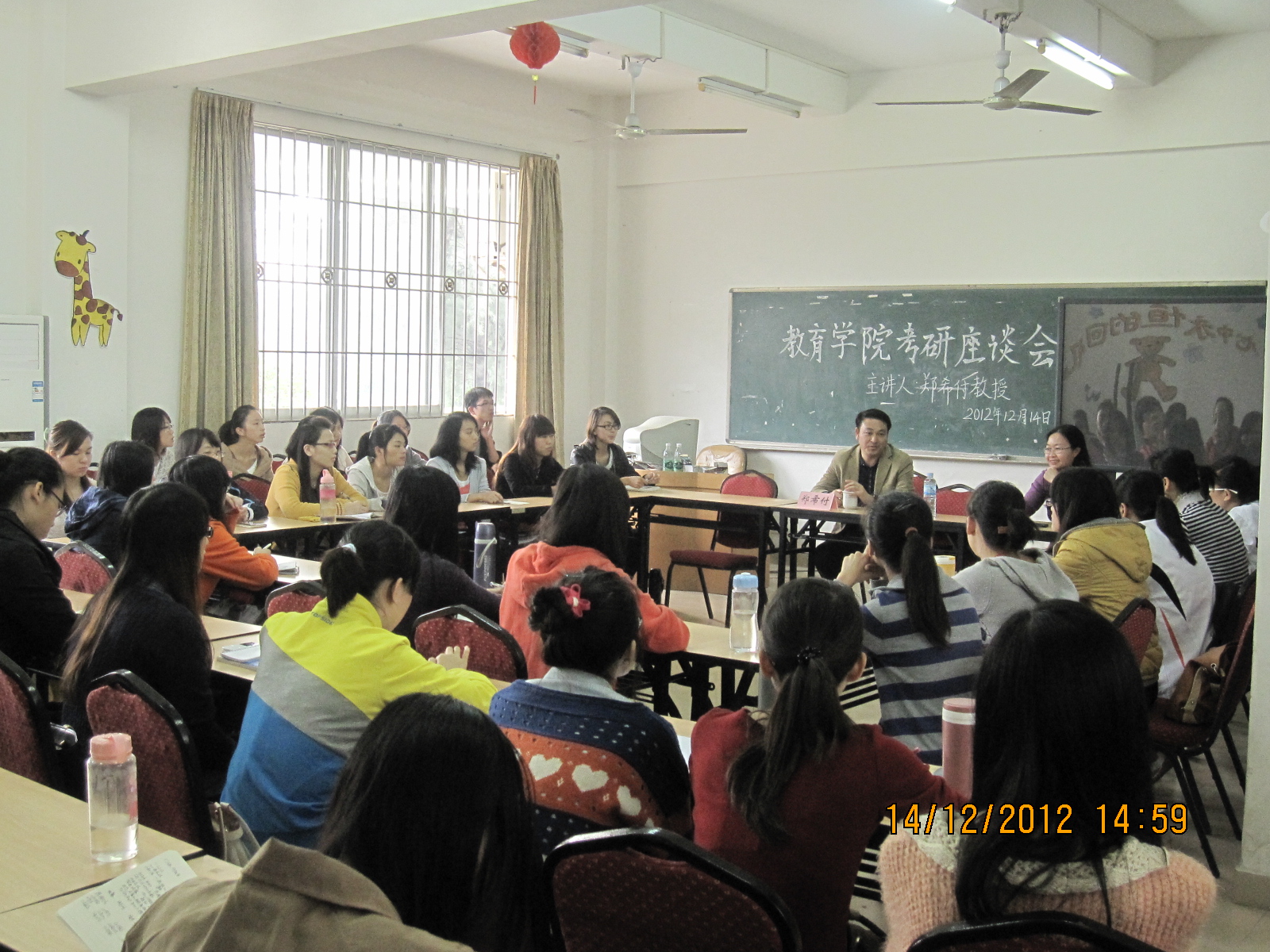 (黄灼华讯)2012年12月14日下午3点,在鲁迅楼演示室华南师范大学博士导师郑希付教授为我院学生坐在一起亲切交流,为我们解答硕士研究生考试相关问题。我院副院长黄曼娜老师也莅临座谈会。