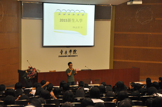 接着,黄华老师以“大学是什么、如何度过大一和遇见美好的自己”为新生演讲。”在这个引人深思的问题下,黄华老师列举了大学里各种各样的对比,向大家展示大学的样子,给各位新生留下了自我思考的空间。关于“如何度过大一”,黄华老师提出了自己的建议,他希望大家能够对未来有所期待,成为一个有担当,会感恩别人的人,并且能够对目标持之以恒。并且,他建议大家离开舒适区的风险,学会用行动来告知答案,以此来遇见未知的自己。