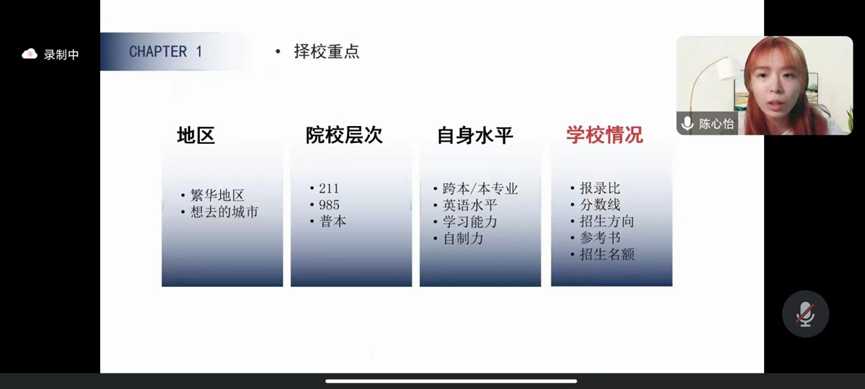 在考研经验分享环节,陈心怡围绕择校问题、信息获取、312考试与心态问题等内容展开经验分享,并结合自身备考经历,对各科目的复习安排以及心态调整等方面给出了切实的建议。周幸柔从自身的基本情况和备考经验出发,详细介绍了在备考过程中使用的学习方法,并强调要重视真题和复盘。许思曼就调剂问题作重点介绍,从调剂的规则、调剂的难度和复试的内容等方面作了详细的分享。