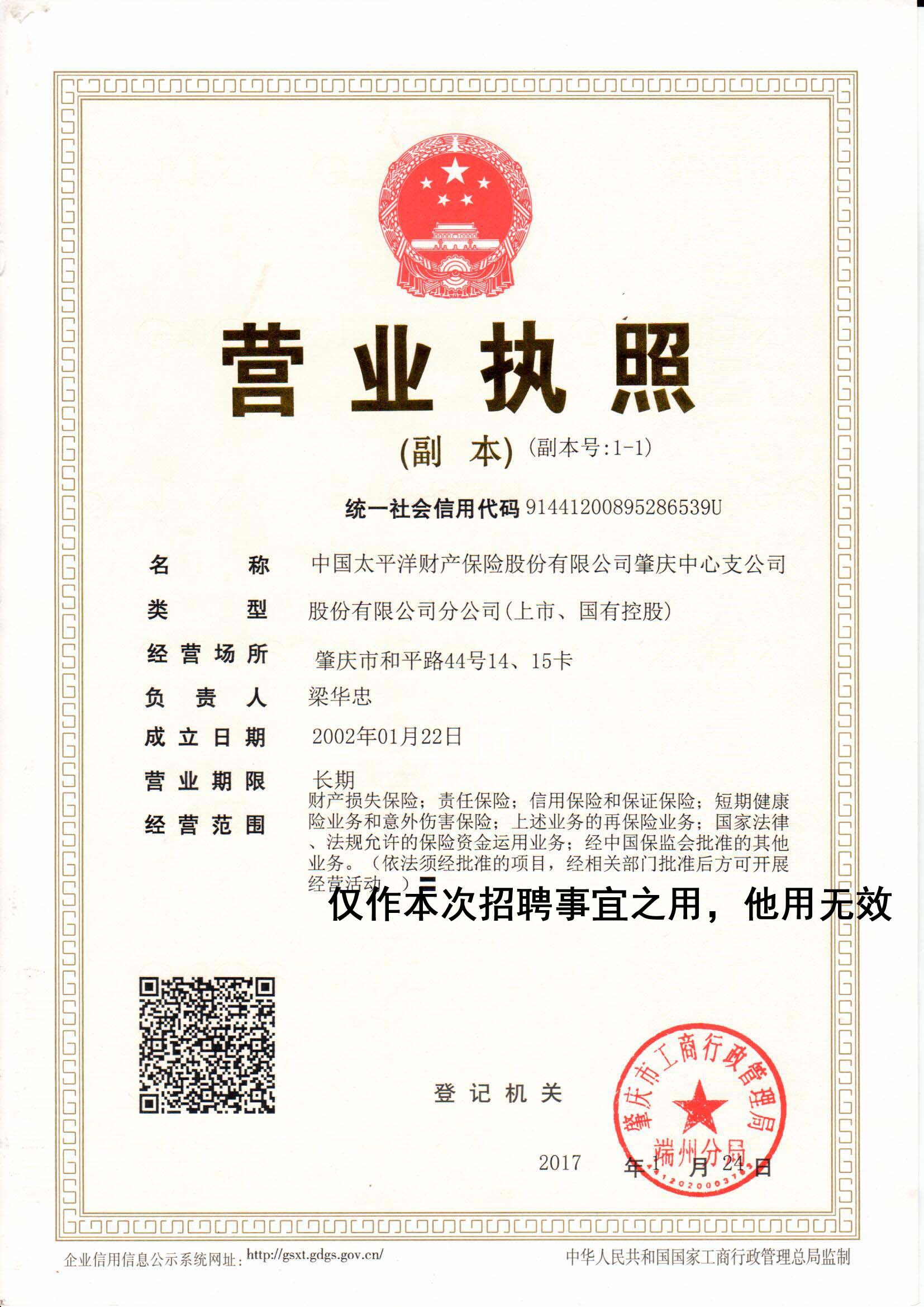 中国太平洋财产保险股份有限公司是中国太平洋保险(集团)股份有限公司旗下的专业子公司,承保人民币和外币的各种财产保险、短期健康保险和意外伤害保险业务。公司承保业务涉及航空航天、电力能源、石油化工、基础建设以及金融贸易、船舶汽车、机械设备、电子通讯、仓储物流、纺织烟草、科技创新等各行各业、各个领域。我司太平洋财产保险肇庆中心支公司是地级市中心支公司,承保各种汽车保险、非汽车保险等财产保险业务。
